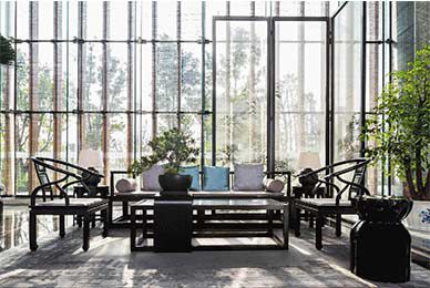 丝帘将天光过滤得十分柔和细腻,屏门开关之间光逐渐变化,景自然衔接,人动影随,动静转换。